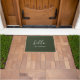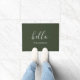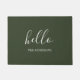 Personalised Hello with name door mat. Green with white modern script and traditional block text.