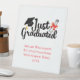 Personalised graduation party pedestal sign. Add the graduates name, degree and school to this graduation sign. Can be used for High School, College, Medical School, Law School, Dental School, etc. The Just Graduation image can be swapped out for a picture of the graduate if you wish.