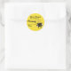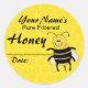 These personalised canning stickers will fit on top of your glass jam, jelly, and preserves jar lids. They have an image of a cartoon smiling bee on a honeycomb pattern background.