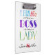 Personalised I am the Boss Lady Typography Clipboard. Personalise front side with name and initial. Watercolor typography text reads I am the boss lady in rainbow watercolor style. Back side is black background with white and light red name and initial. Fun feminine typography for female bosses and moms. Modern stylish feminine gifts.