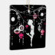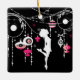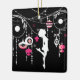 This Irish Dance Christmas ceramic ornament features a silhouette Irish Dancer dancing hard shoe performing a toe stand. There is a festive holiday background of pink and white ornaments with string lights on black. The back, of the ornament, can be personalised with a name, year or any text that you wish to add. -