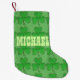 Stocking features an original illustration of a lucky green Irish shamrock clover on a green background. Simply personalise with your name for a unique Christmas stocking!