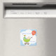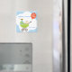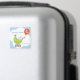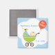The baby boy in lime green baby carrier with lime and skyblue hood. The balloon is in hazy orange attached to the handle. A bird sitting on the hood is in gold yellow with chocolate brown wing. The texts are in skyblue and customisable. This is a digital illustration.