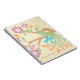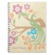 This spiral bound notebook journal has a light tan faded damask design in the background. There is a colourful floral branch with a peacock sitting on it. On the bottom left, you can easily customise this with your name.