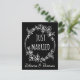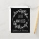 This wedding announcement postcard features a hand drawn white flower wreath highlighting Just Married printed in a bold white font with a contrasting black background. You can customise the card with the names of the bride and groom printed in a white handwritten script font.