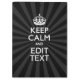 A personalised Keep Calm saying on an elegant black and charcoal sunburst. Humourous or whimsical try on your creative words on two editable lines of text. Remember to use CAPITAL letters for best results.