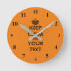 Personalised Keep Calm small size colourful orange Round Clock. Create your own funny keep calm and carry on parody. Background colours can be changed. Great for kitchen wall, study room, bedroom, office, company, restaurant, shop, hotel etc. Also available in large and square shape. Grey or black hand colour.