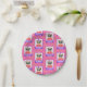 Celebrate your little one's special day in style with this festive custom pink paper plate that features a fun display of photos with purple and pink unicorn horns. In the background there is a pattern of pretty gold glitter hearts. Personalise this bright design with a photo of your birthday boy or girl.