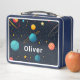 Fun metal lunch box with a colorful outer space planets design, customizable with your name. Perfect for kids!