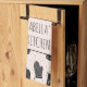 cute illustrated baker or cook kitchen towels with cute kitchen essentials on a dotted pink background. Rolling pin, whisk, eggs, mixing bowls, and more.