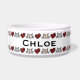 Personalised kitty love pet feed bowl. Bordered food bowl featuring cute tiger striped kitties and hearts design for any cat lover. Choice of medium or large size dish.