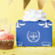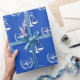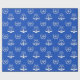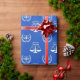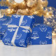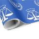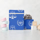 Creative law school grad gift wrap featuring scales of justice on a blue background. To personalise edit text to add graduate's name.