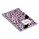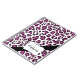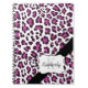 Leopard print design notebook in black, purple, and white with a black stripe and white banner edged with black that you can customise with your name and monogram initial.