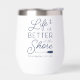 Celebrate life at your seaside abode with this cute personalised wine tumbler featuring the phrase "life is better at the shore" in navy blue lettering accented with nautical flair. Customise with your family name and/or year established beneath.