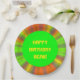Personalised "Happy Birthday" paper plates with bright yellow text. The accompanying digital art features a fluorescent neon orange, green and yellow abstract fractal design, but you can add your own photo or image. The neon lime green circle gives you an area on the design to add custom text. Customise the font style, size and colour as needed for your personalised text message.