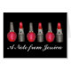 Greeting card design features an original illustration of a row of red lipstick tubes and nail polish bottles. Just personalise with your information for a one-of-a-kind notecard.