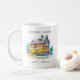Pretty Christmas coffee mug with a pretty watercolor log cabin and pine trees.