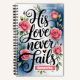 Celebrate God’s unwavering love with this elegant watercolor typography featuring the phrase 'His Love Never Fails,' adorned with vibrant roses and flowing elegant bold calligraphy style. personalised with name.