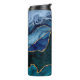 Beautiful personalised thermal tumbler features lux agate and gold vein patterns in peacock colours of blue, green, purple and turquoise.