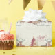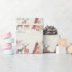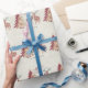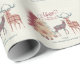 This rustic country Christmas wrapping paper has three patterned Christmas trees in plaid, polka dots, and snowflakes patterns on muted shades of burgundy, tan, and green gold stars on top of two of the trees. There are also two plaid standing deer in a matching colour scheme. The buck has dusty blue-grey antlers. There is fancy burgundy lettering that says "Merry Christmas" beside the trees. It is also personalised with your family name or other text in blue lettering or you can delete it if you don't want to personalise it.