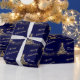 This festive personalised navy blue and gold Merry Christmas wrapping paper has a gold tone Christmas or Holiday tree with ribbons and star dust on it. If you need any matching items, or if you need assistance or changes, please email niteowlstudio@gmail.com.