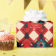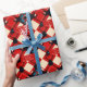 This Christmas wrapping paper features a bold and modern geometric design with a mix of red, cream, black, and teal shapes. The pattern is created by overlapping squares and diamonds in varying shades, forming a striking and intricate look that adds a contemporary twist to traditional holiday wrapping. The addition of personalised text, such as “Merry Christmas to [Name] from [Sender],” is elegantly printed in a stylish cursive font on the paper. This customisation option allows for a heartfelt touch, making each gift distinct and thoughtfully prepared. Perfect for those who appreciate a unique, artistic style in their holiday decor. The text or message which is on the wrapping paper can be replaced and personalised. This aspect makes the wrapping paper and your personal message suitable for many occasions, including Christmas.