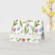 The product design features a pattern of colourful tulip flowers in purple, red, pink, blue, and yellow. This botanical illustration with personalised text makes an elegant modern and unique greeting card.