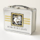 The design features a pair of ice skates over a snowflake crest with faux gold glitter, black, and white background. This elegant winter sports design serves as a cool modern and unique lunch box with personalised text for figure skater, ice dancer, speed skater, and more!