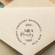 Add a touch of modern elegance to your outgoing mail with our beautiful return address stamp, a sleek, personalised design perfect for any stationery lover. This stamp features a stylish circular layout with your custom address wrapped neatly around the border in clean, contemporary typography, creating a refined and professional look. At the centre, your custom name and family name take the spotlight, displayed in two beautifully coordinated fonts that bring personality and charm to every impression. A delicate hand-drawn botanical leaf anchors the design at the bottom, softly completing the circle with a natural, artisanal flair. Ideal for wedding invitations, personal letters, small business packaging, or everyday correspondence, this return address stamp makes your mark with effortless style and warmth.