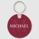 features personalised name in white and monogram in light burgundy red as background, in classic serif font style,
