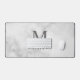 features personalised monogram and name in grey classic serif font style on white marble background.