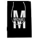 featuring personalised monogram in white bold modern sans serif font style with box of name in the middle of monogram on black background.