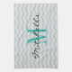 Personalised family name monogram grey chevron kitchen towels. Cute kitchen / cooking gift idea for hosuewarming party, newly weds couple, wedding favour, engagement, anniversary etc. Stylish zigzag stripe design with custom monogrammed initial letter ans script typography. Add your own surname. Turquoise blue and grey zig zag print.