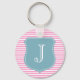 Personalised monogram keychain | initial J letter. Elegant initial letter with customisable background colour. Cute gift idea for women and girls. Pink stripe pattern with turquoise emblem shield.
