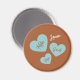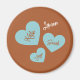 This cute design starts with a rich nutmeg brown background and features 3 coordinating hearts in a cluster, holding your loved one's names... in modern script font. Your name sits just above. Add your names by following the "Personalise this template" prompt. Makes a wonderful gift for mum! This button design also looks smashing on the coordinating apron and oven mitt!