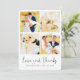 This simply chic four photo collage wedding thank you card template features a crisp modern look. We've chosen rounded corners as the default shape, but you can easily change that to sharp corners, as that look also works very well with this design! We've given this minimalist design a warm touch with 'love and thanks' below your favourite photos in a relaxed, all lower case script that feels intimate and familiar. This element of the design can't be altered. When you edit the sample first names and date on the front and replace them with your own, you can also change the font and colour of the text if you prefer another look. We've chosen a dark grey tone that is in fact mostly black as the default colour for your names, to go with the black 'love and thanks' message above. We've also chosen a shade of grey as the default for the text on the back. We've put some sample text on the back for you to replace with your own message as you see fit, but please don't feel restricted by this. If you prefer delete our sample text entirely and keep the back totally blank so that you can write a handwritten note on each card instead, you can do that. Or you might want to replace our text with your own message of gratitude and your own closing and then hand sign your names when you receive the cards. And while we've chosen all capital letters, you might prefer to change to a mix of upper and lower case, and/or change the font, size or colour of the text. Just please be sure in any case to delete our sample/placeholder text on both sides of the card, and please remember to replace all four placeholder photos on the front with your own. The background on the front is white and this cannot be changed. The default background on back is transparent so that the colour of the paper will simply serve as the base tone. You can change this by picking another colour in the editing tools if you'd like. Use the intuitive design tools, your favourite photos and your inspiration and make this four photo collage wedding thank you card uniquely yours! And please browse our wedding thank you collection for more simply elegant modern motifs.