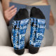 Cute guys shades of black, medium blue and white name all over personalised socks. Put any word or name all over this fun typography fashion accessory. Loads of colours and fonts with first name or chosen word repeated allover. Awesomely significant and fun gift idea for dad, son, brother or anyone!