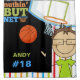 Boys basketball theme shower curtain for the boy who loves and plays basketball, features a stick figure boy with brown hair and eye glasses, basketball, basketball net and backboard, text that reads Nuthin' But Net, and an area you can easily personalise with his name and jersey number!