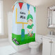 Boys football theme shower curtain for the boy who loves and plays football, features a boy football player in a green uniform and helmet, goal post, flags, and an area you can personalise with his name and number!