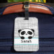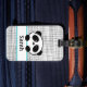 These trendy and modern personalised luggage tags have a stylish black, aqua blue and white panda design on a black and white doodle background.