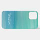 Personalised name aqua watercolor iPhone 12 case. Handdrawn water colour painting with handwriting typography. Cute handwritten text template for name or monogram. Stylish design for women and girls. Beach theme background image. Sea green and turquoise blue colours.