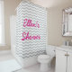 Personalised name chevron pattern shower curtains. Elegant grey chevron zigzag pattern shower curtain with neon pink text template. Stylish script typography. Zig zag stripe bathroom accessories for men and women. Cute print design. Custom size and colour. Trendy home decor.