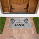 What a unique and beautiful addition to your lanai! Put the finishing touch on your outdoor oasis with this custom doormat. The design features tropical coconut palm trees on a [faux] wood grain background. The colours are black and grey. The text reads "William & Jessica's LANAI" which will be edited and replaced with your personalised names. The bottom text reads "Sit Long - Talk Much - Laugh Often." Upgrade your own lanai with this custom doormat or use as a housewarming gift, just moved gift, patio renovation gift, or practical retirement gift. Please browse our complete collection of tropical-themed cards, apparel, kitchenware, home decor, and more! Special design requests accepted.