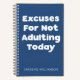 Keep track of your "reasons" in style with this Humourous "Excuses for Not Adulting Today" Notebook, featuring bold white text on a classic navy blue background. Perfect for jotting down thoughts, plans, or, of course, creative excuses, this customisable notebook is both fun and functional. Add your name or a personal message to make it uniquely yours. Whether for personal use or as a lighthearted gift, this notebook is ideal for anyone who loves a touch of humour with their organisation. Choose from lined, blank, or graph paper inside to suit your needs and get ready to skip a day of "adulting" in style.