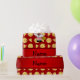 Cute Italian chef boy with chef jacket, black moustache, red tie, red white chequered apron, black hair, chef's hat, brown eyes and pizza and on a red pizza pattern background and black red stripe. Personalised with your name gifts or monogram gifts or your initials. Cute chef gift ideas for kids, boys and girls. Ideal for birthday's party. If you hit the customise it button you can change the colour and type of font.