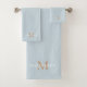 Modern, elegant and trendy bath towel set featured here in dusty blue with tan monogram and white name typography. Colours can be customised to your choosing
