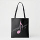 Simple black and white and pink music note bag with your name printed on it with a modern and elegant handwritten calligraphy script font in black over an eighth note in pink. Text colours and fonts can be changed, making the book bag perfect for multiple kids to store their sheet music and instrument books at home and carry them to lessons.