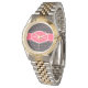 The watch is very nice, the picture is great and the watch looks like quality. The only problem I am having with it is that it is a little too large, and I also can't figure out how to open the clasp. No directions came with it. Very good. The printing is perfect and the watch keeps good time.