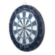 Custom text dartboard with a nautical colour scheme featuring a dark navy blue frame and 2 shades of blue on the dartboard with an off-white mix.