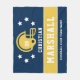 Personalised football themed fleece blanket for players when they're not scoring touchdowns on the field, and for their parents to support their kids and stay warm at chilly games! Makes a unique team gift. Design features a football helmet customised with the player's uniform number, custom text for the player's first and last name, and modern text for the team name. Stylish and modern design features sporty varsity jersey lettering and simple horizontal stripes with star accents. The colour scheme of navy blue, maize yellow, and white can be modified to coordinate with your team colours.